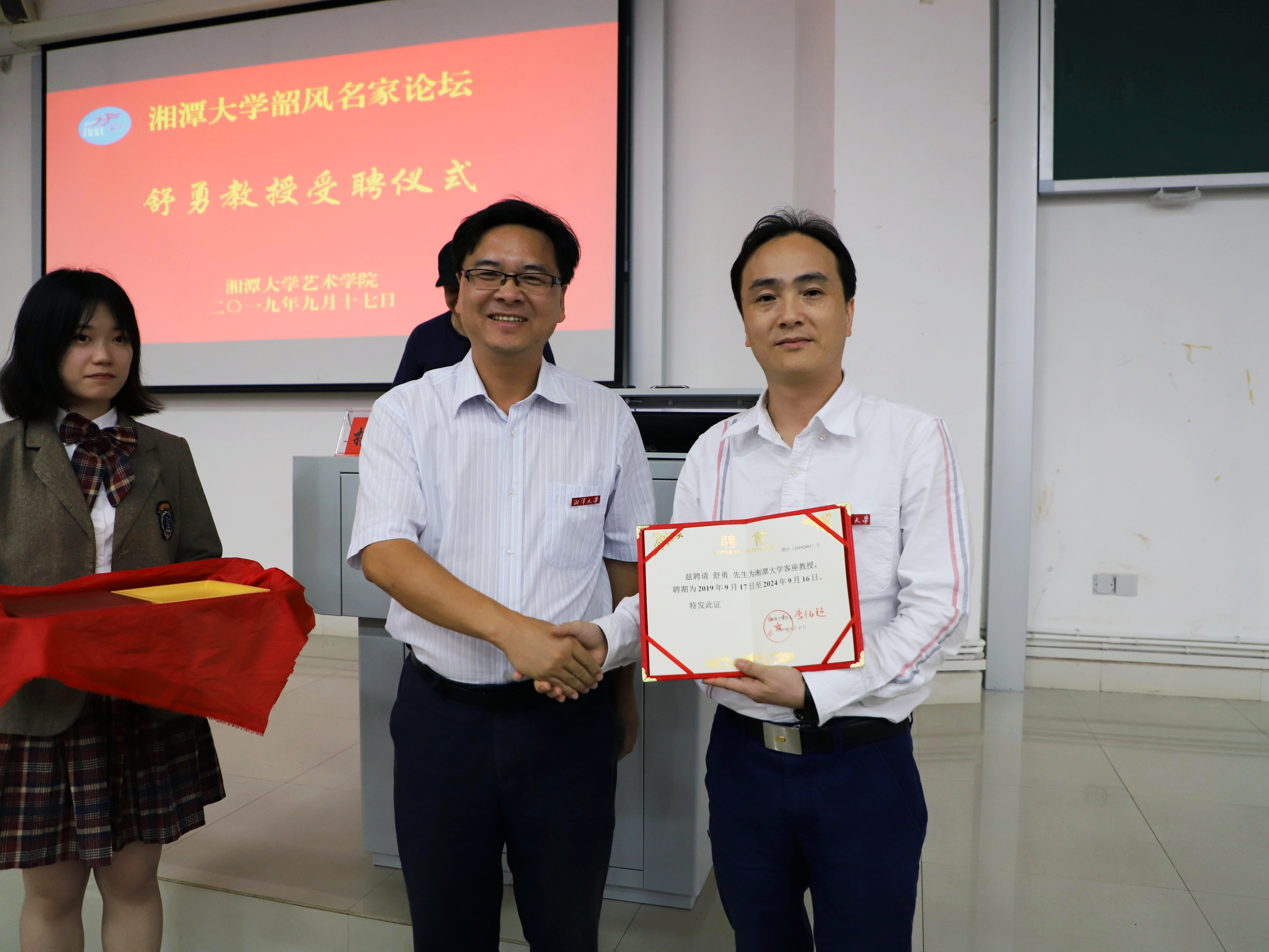 报告会正式开始之前,举行了特聘教授聘任仪式。校党委委员、副校长廖永安为舒勇教授颁发yl23411永利集团官网特聘教授聘书并佩戴校徽。