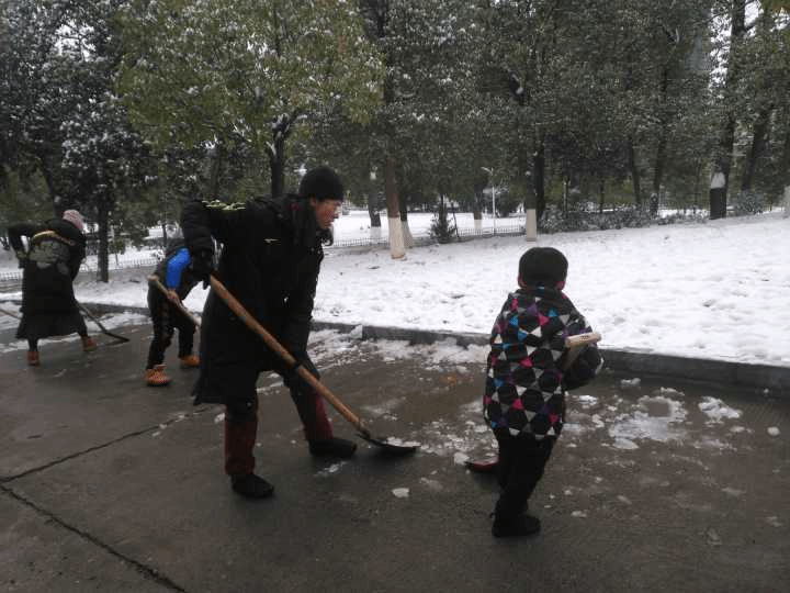 活动开始后,大家积极地投入到除雪工作当中。冷冽的北风和零下几度的低温使扫雪工作异常艰难,老师和同学们的手和脸都冻得通红。然而,这一切丝毫没有影响大家的热情和工作效率。在领导和老师们的带领下,同学们积极投身到扫雪过程当中。党总支副书记刘行的两个儿子精神十足、拿着小铁锹忙的不亦乐乎,在辛苦的清扫的过程中也给大家带来了欢声笑语。忙碌的身影在皑皑白雪中形成了一道靓丽的风景。虽然室外温度很低,但大家劳动的热情和团结的力量让这个冬日变得格外温暖。