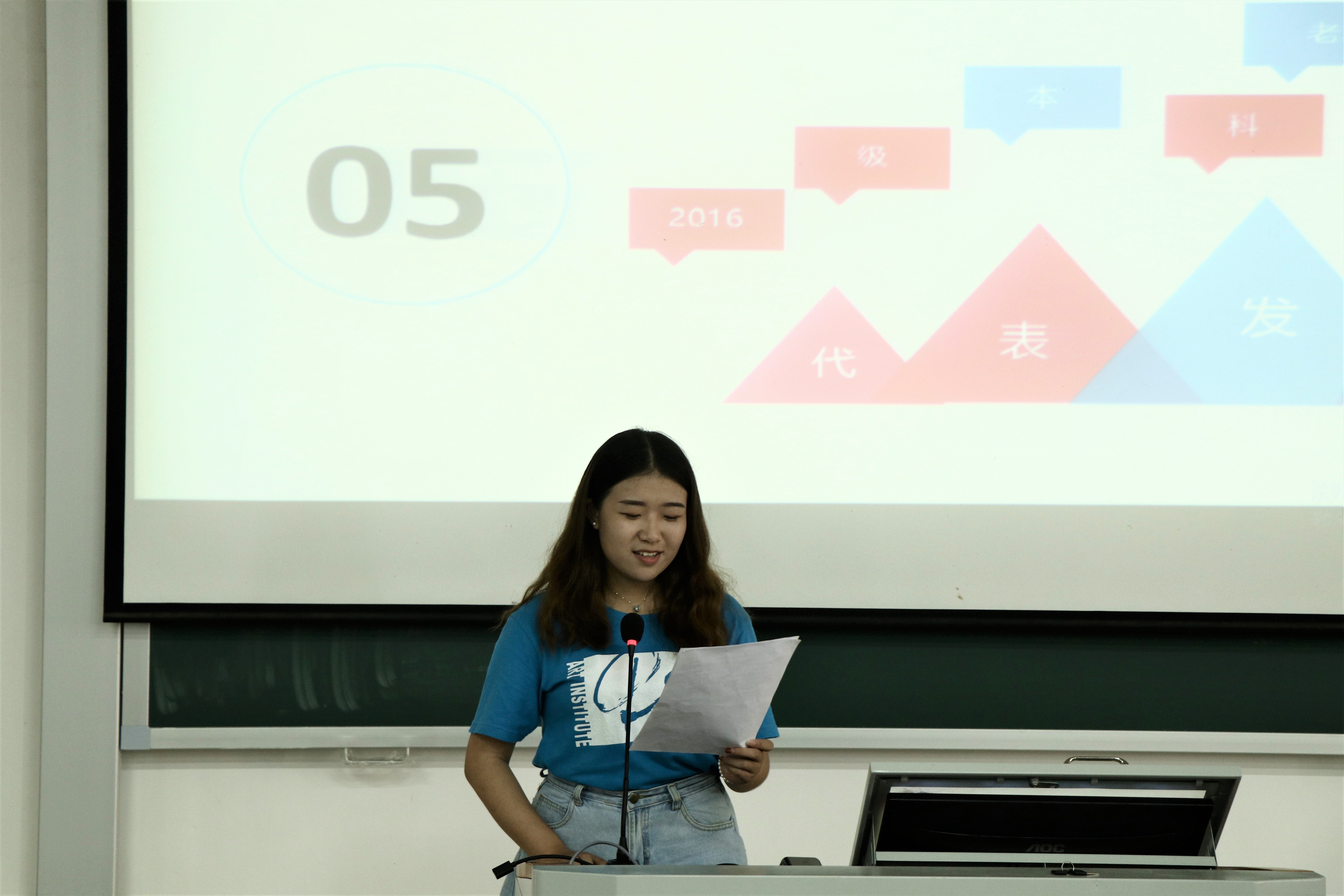 15级在校生代表张林雨在开学典礼上对新生说:很开心有这么多“00后”新成员加入这个大家庭,作为学长学姐,在衷心祝福你们的同时,也会伸出热情的双手,予以你们鼓励和帮助,最后祝愿你们在大学期间的每一天都开心快乐无悔圆满!