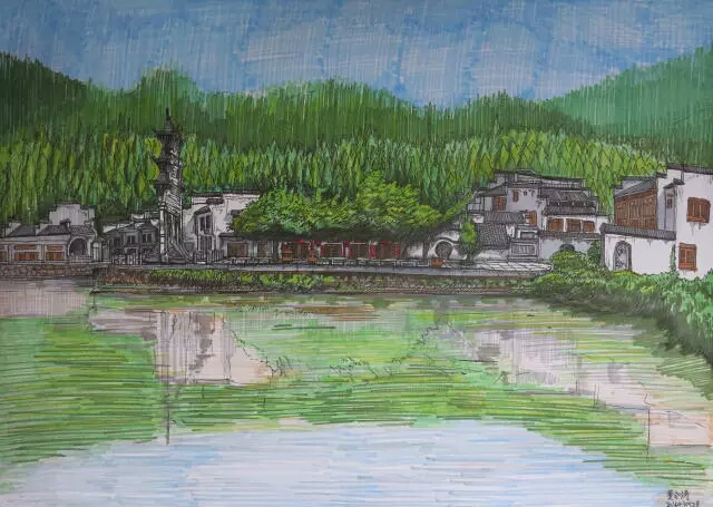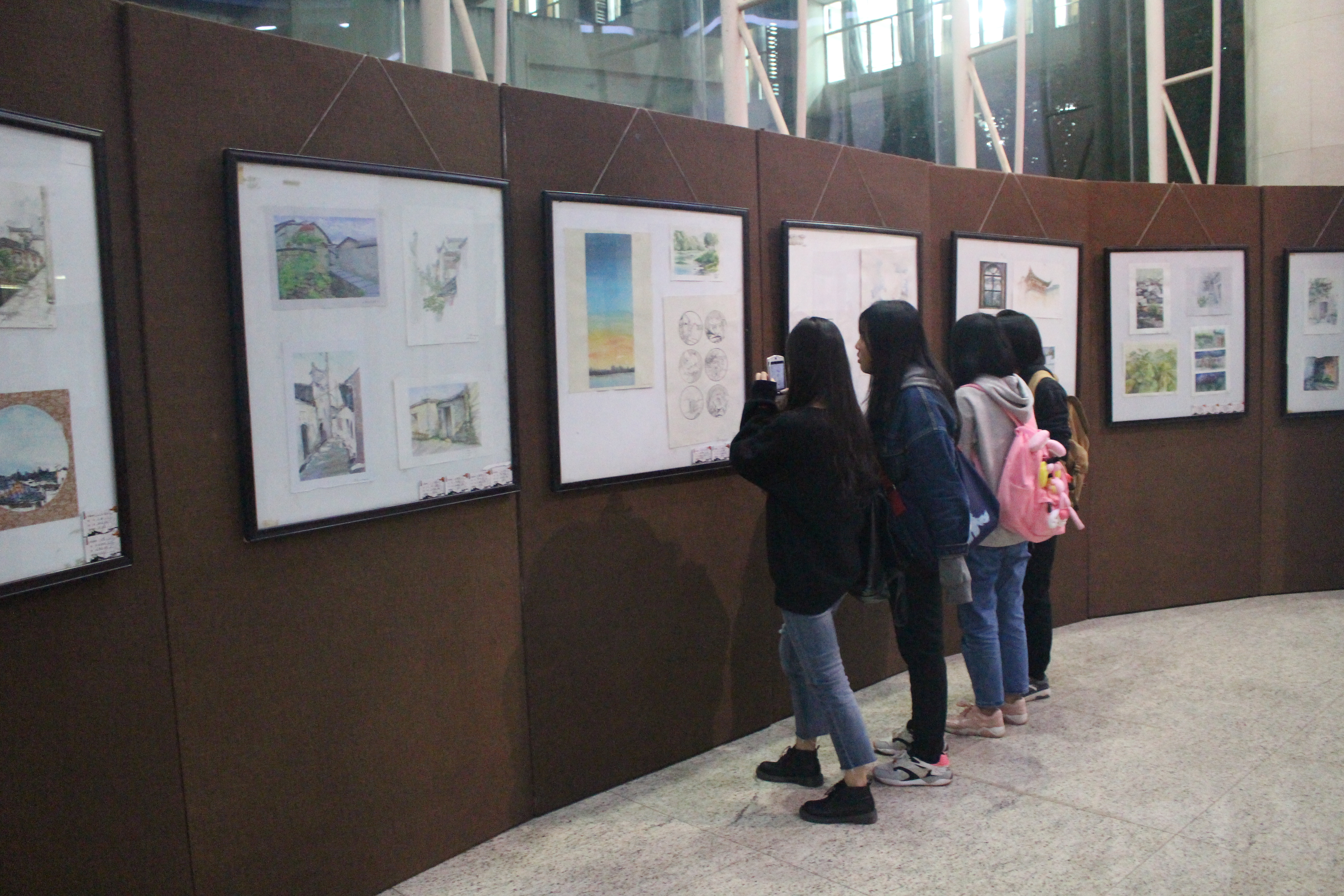 次此作品展收集了2016级学生创作的200多幅写生作品。展览上,每一作品充满了西递古村落文化气息,同时又被画者赋予了独特的灵魂。从一幅幅作品展示内容上对比,特别是新旧建筑与环境的和谐,反映了社会主义新农村的巨大变化。古老建筑的保留,展现了中国传统建筑艺术的魅力,体现了人民对传统艺术的传承。农村优美环境的保护,展现了党领导人民既要金山银山,更要绿水青山的传承保护理念。作品《间》运用强烈的对比色彩,精确的构图,勾勒出建筑与树木之间的和谐关系,彰显着人文与自然结合的力量;作品《墙外》好似一股清新的气息从浅淡的水彩中溢出,让我们产生了微妙的联想,令人沉浸,味无穷;作品《老屋》将光灵活的应用起来,描绘出了老屋原有的沧桑,仿佛述说着曾经在此发生的美好故事;作品《村口》运用简单的线条和独特的笔法技巧,将村子的生气用愉悦的绘画方式表达出来,依依不舍的情感油然而生。