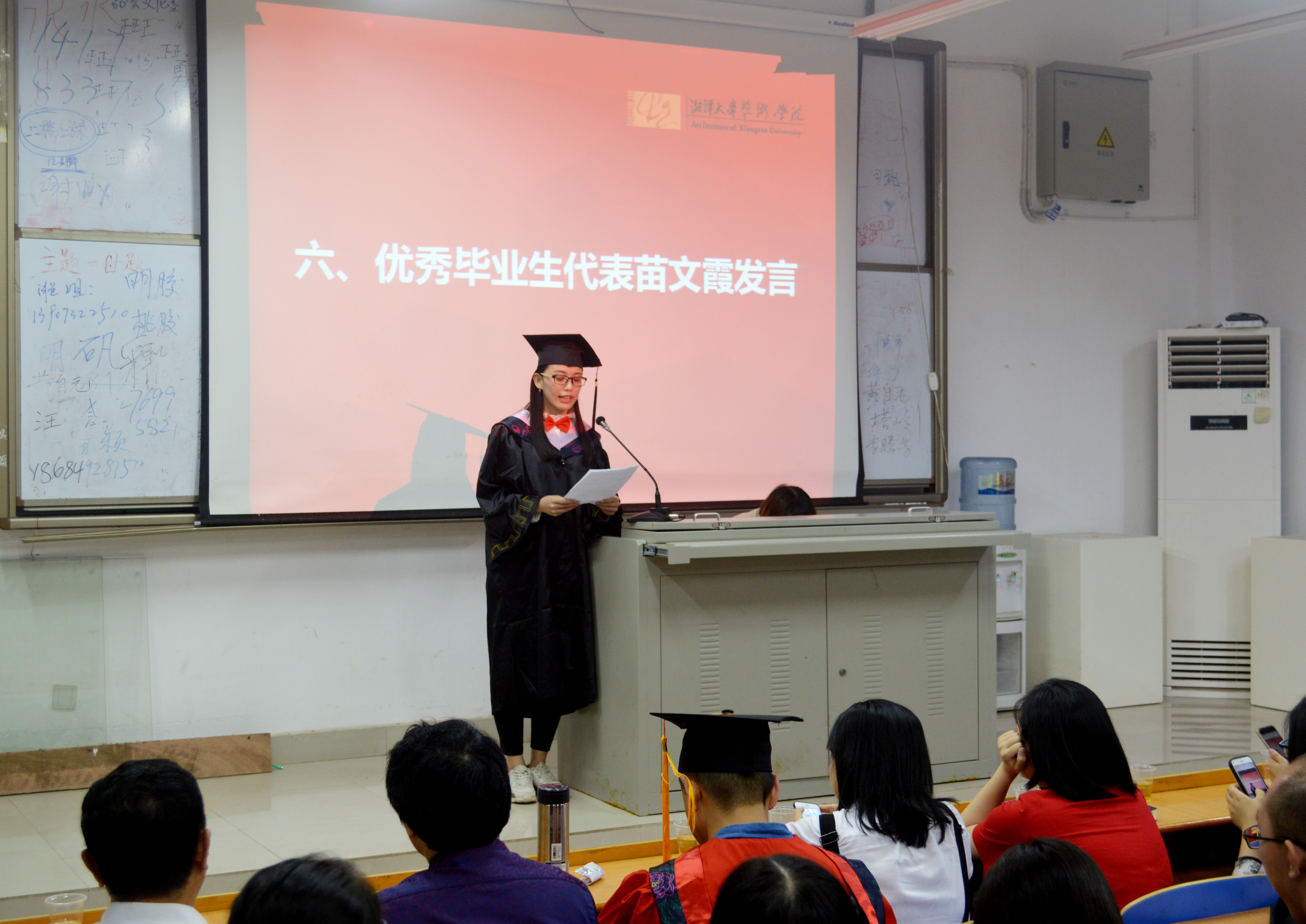 毕业生代表苗文霞说出了全体毕业生的心声。“几载求学路,一生湘大情。我们经历了大一的纯真年代,走过大二的轻舞飞扬,告别大三的紧张忙碌,现在,我们也迎来大四的依依惜别的种种感慨。再回首,这四年的路我们走的辛苦而快乐,这四年的生活我们过得充实而美丽,这四年有太多的情景值得我们去回忆,去珍惜。忘不了刚踏入校门的那刹那和上课打不出问题的尴尬,更忘不了通宵熬夜却没获得奖项的比赛。所有这些温暖的记忆都将铭刻在我们灵魂深处”