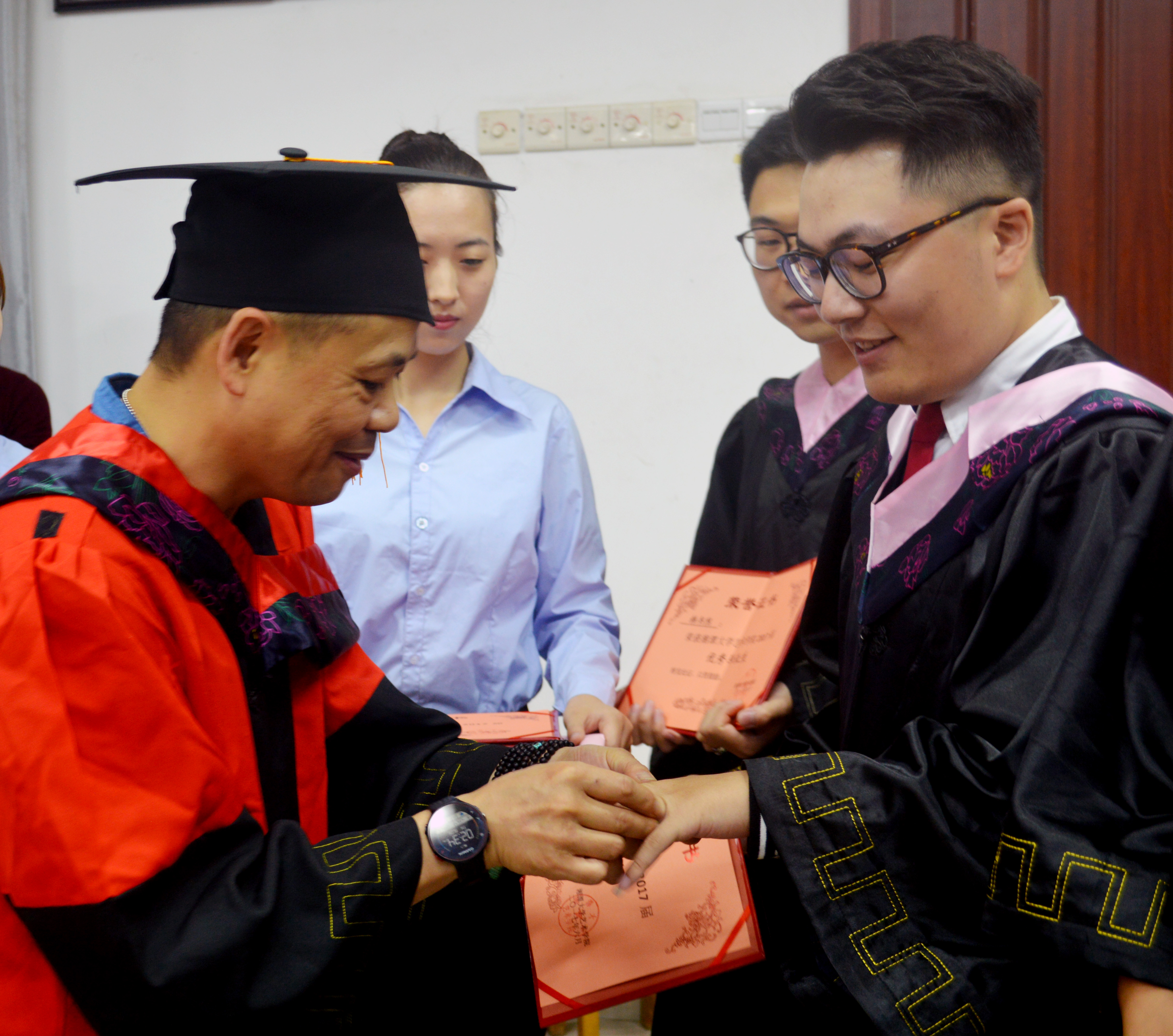 典礼上,yl23411永利集团官网党委副书记马卿宣读了优秀毕业生和优秀毕业作品奖名单,yl23411永利集团官网党委书记周维平、院长黎青、副院长罗豪畅为获奖者颁发了荣誉证书。当黎青院长为集团优秀毕业生带上了带有yl23411永利集团官网LOGO的戒指时,现场响起了雷鸣般的掌声。