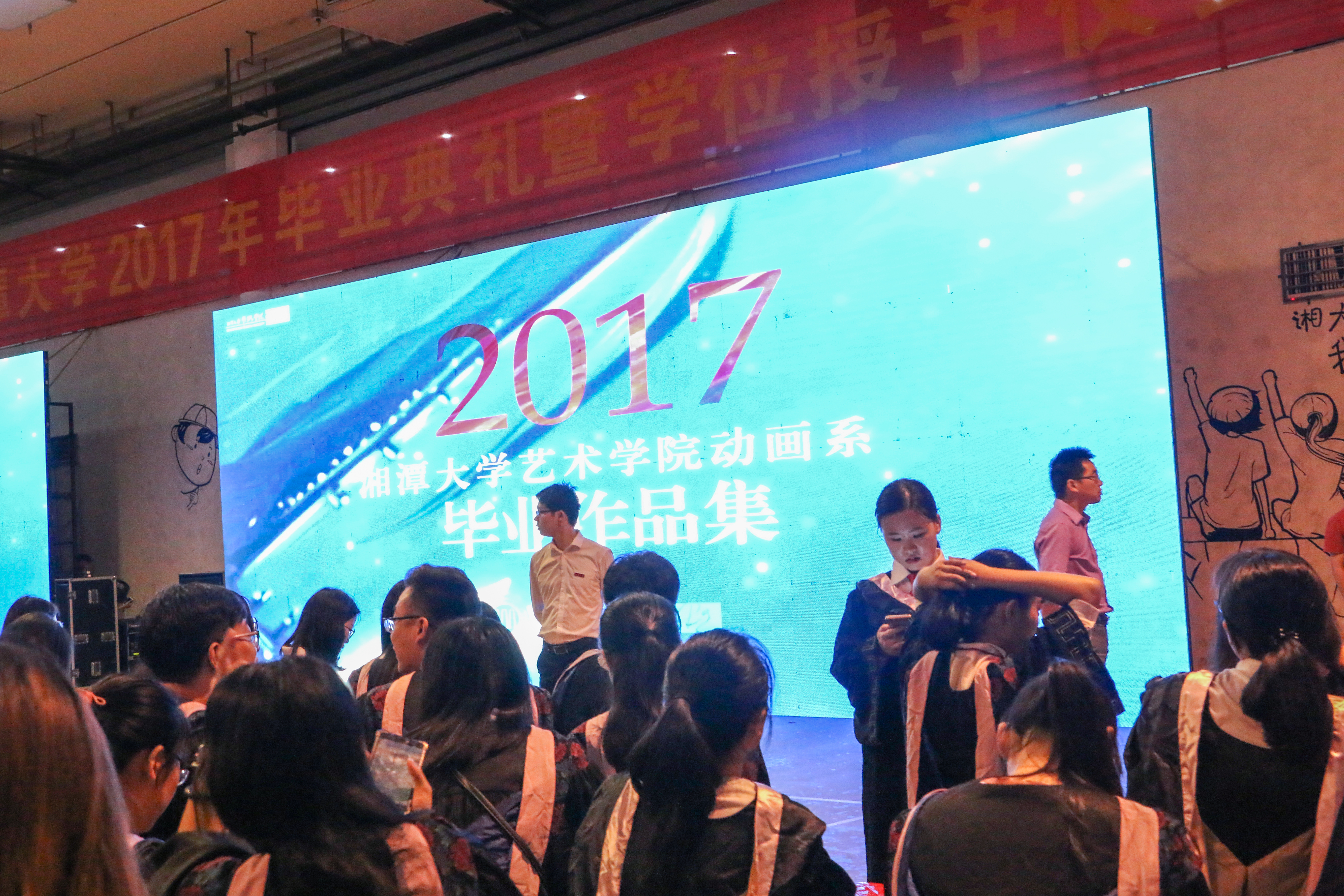 “太开心了,毕业典礼的巨大屏幕居然播放了我和同学们的毕业作品!”yl23411永利集团官网三维工作室的徐婷婷在主会场的看台上兴奋得跳了起来。这是二维工作室的毕业生杨云龙收集了26位同学的毕业作品,悄悄剪辑赶制的视频合集。“四年的学习成果化作一段精美的视频向全校师生和家长展示是作为湘大学子最大的荣耀。我想给我的同学一些惊喜和一些特别的记忆,我做到了!我们的作品,我们创造,我们的典礼,我们装点!”