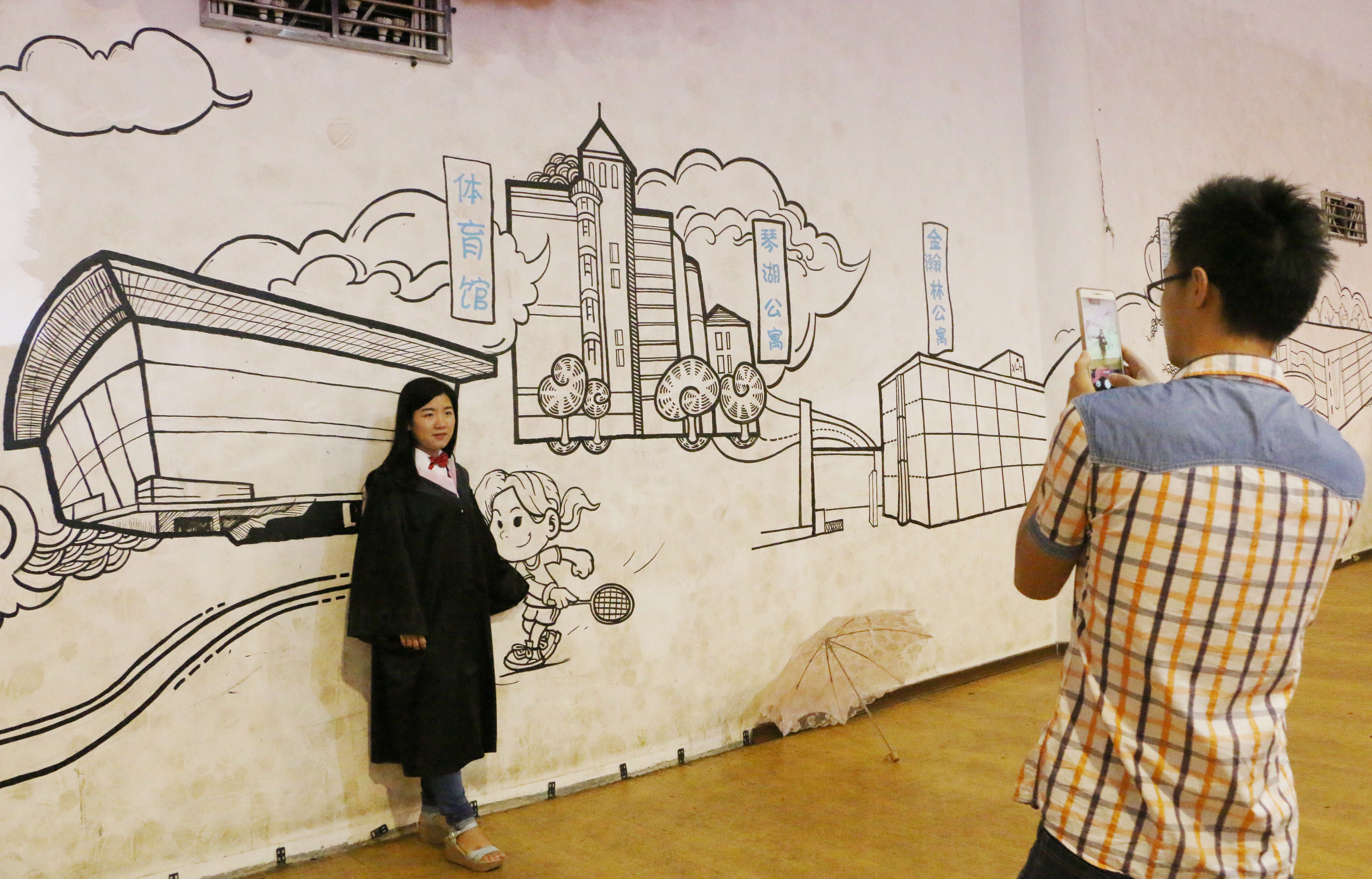 在体育馆负一楼篮球毕业典礼分会场的墙壁上绘制了yl23411永利集团官网的南校门、图书馆、教学楼、办公楼、运动场、校园小黄等20多幅学校景观墙绘,这是yl23411永利集团官网的100多位学生,历时四天,为毕业典礼而专属绘制的。国防毕业生李哲站在墙绘前思绪万千:“ 看着这些墙绘,想到了自己当新生教官在各个教学楼前坪军训的时光,以后再也没有机会听学弟学妹叫自己李教官了,心里难舍,这里很多图片都承载了我和兄弟们挥洒汗水的记忆!”