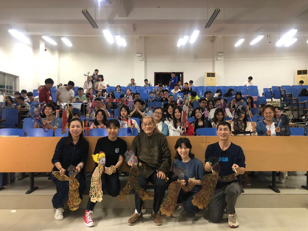 课程已完成三次课程教学,每一次课程均座无虚席。课程开篇,从非物质文化遗产的概念入手,解读了这一概念的由来和内涵,并介绍了“传依”在非遗科研孵化、“非遗+扶贫”、“非遗+专业教学创新”、“非遗+双创培养”各方面的成果。第一节课的实践环节中,团队邀请滩头年画“忠良美年画坊”手工艺人彭国雄老师,彭老师介绍了作为首批国家级非物质文化遗产项目,滩头年画的文化历史、艺术特征,现场展示了拓印年画的基本流程。学生在课堂现场纷纷举手、试炼制作年画。第二节课的实践环节由yl23411永利集团官网教师、“传依”团队成员罗俊敏老师主讲,作为一名湖南湘西籍土家族女性,罗老师讲述了湘西的特色非遗项目名目,现场教授学生们湘西扎染技艺。课程前,团队悉心地为每一位同学准备了一张手帕和相关的线绳等工具,课程中注意派发给同学,并配备学生助教,协助同学们完成扎、染、洗、晾、晒等环节,课程结束后,每位同学都创作出了自己原创的扎染作品。第三节课内容主题为 “湘潭特色非遗纸影文化传承与创新”,邀请了省级非遗传承人吴升平、吴渊祖孙两,二人共同演绎了湘潭传统的皮影戏,同时也设计了符合当下时代主题的新段子,教授同学们皮影演绎技艺。新主题与老手艺结合,新一代年轻学子向传承人现场拜师学艺,课堂上不光实现了主客体转换,更切实提高年轻人对传统文化的兴趣。