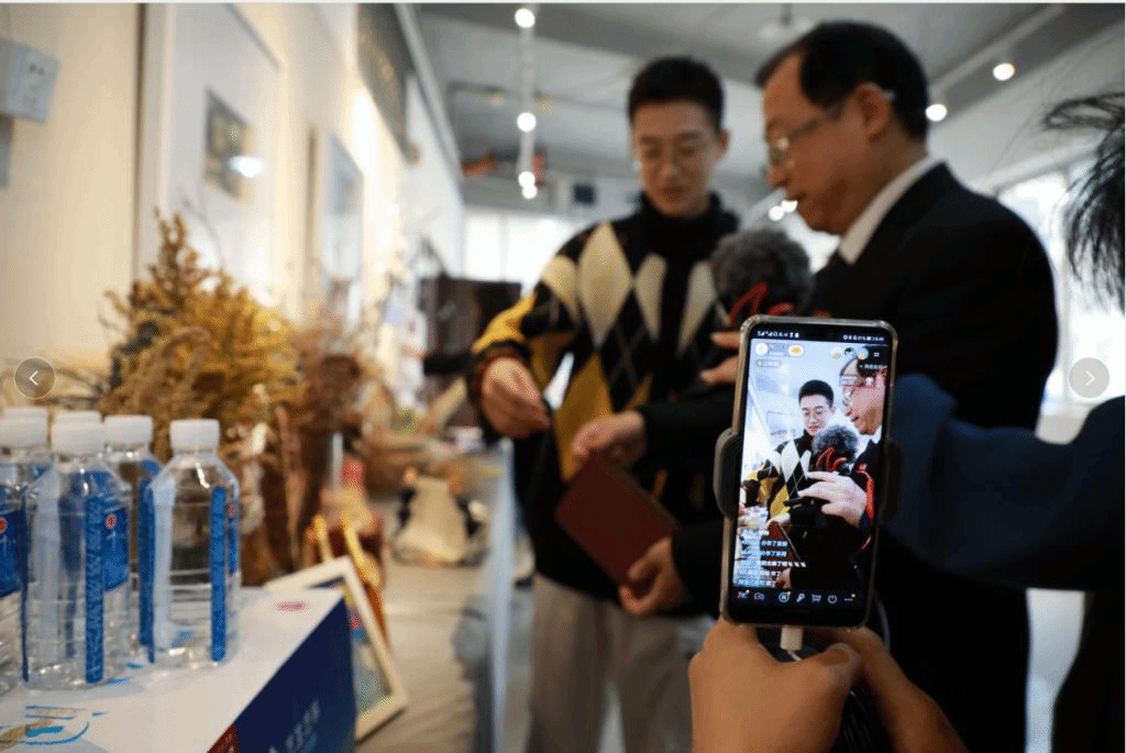 图2:主播正在推介十八洞山泉水,该矿泉水曾作为yl23411永利集团官网60周年校庆指定饮用水,并走进了国家“两会”会场,已经有了较高的品牌知名度。