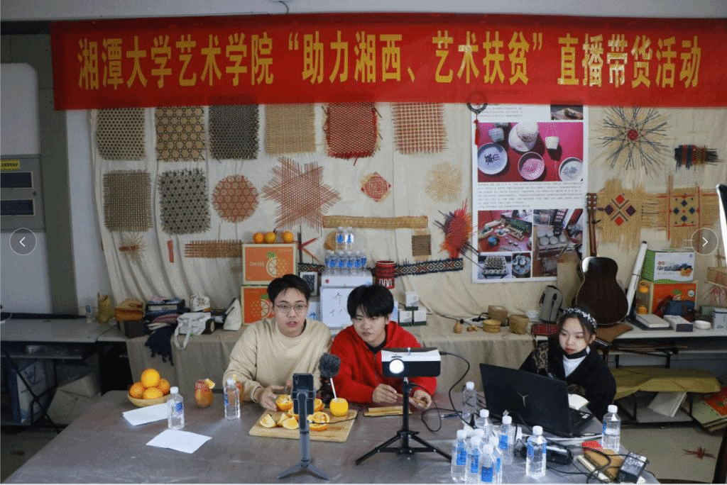 学院随即成立了非遗研究团队开展文化创意产业研究,助力“精准扶贫”。在艺术扶贫的道路上,学院师生为湘西本顺竹编、脐橙、山泉水、茶叶、湘乡非遗烘糕等多个产品进行新媒体营销推广、创意装置设计等,大大提高了原生态产品的品牌价值与文化效应。学院的人才培养质量、课程体系建设、学生创新创业能力培养均得到了大幅提升。