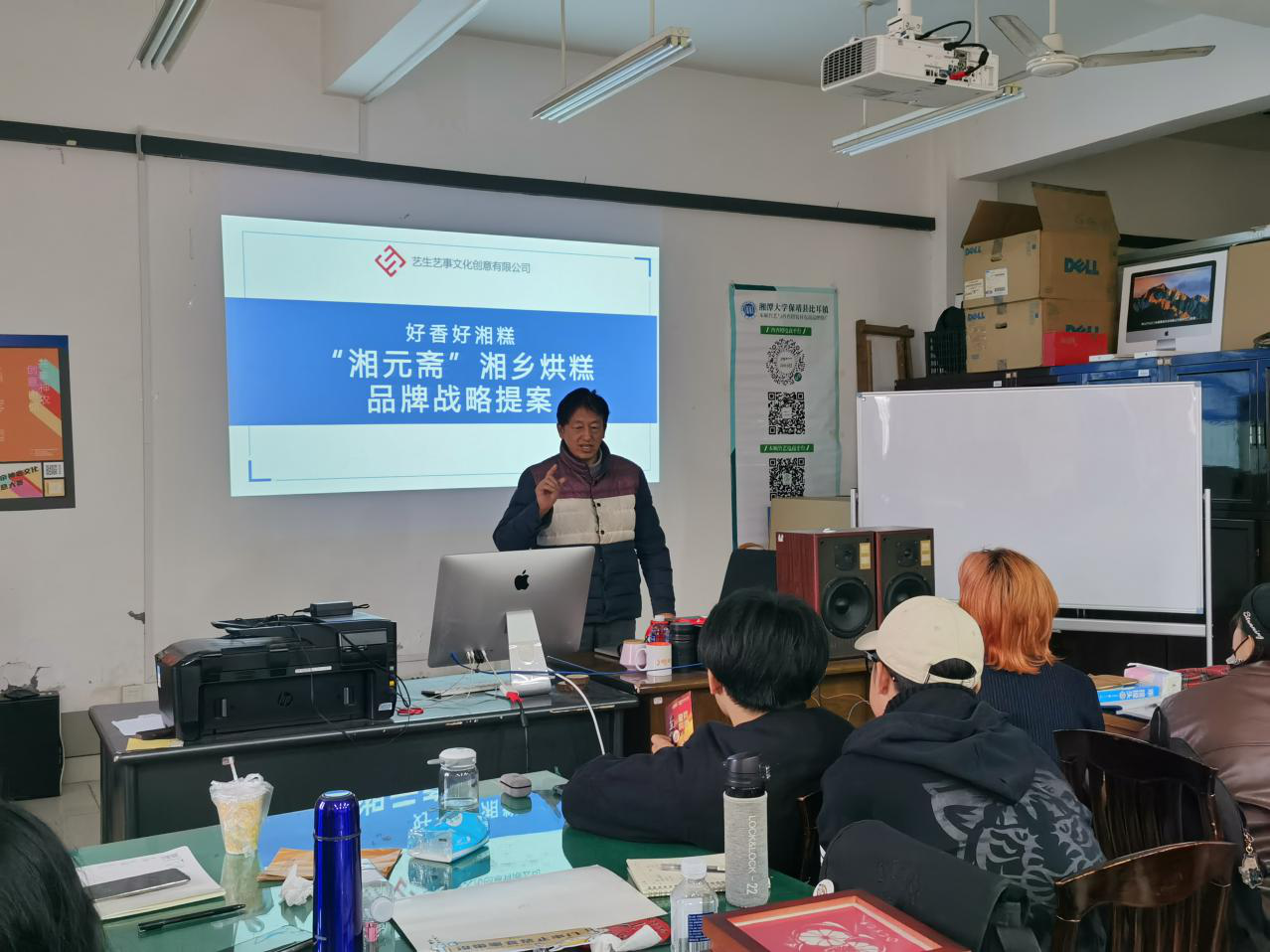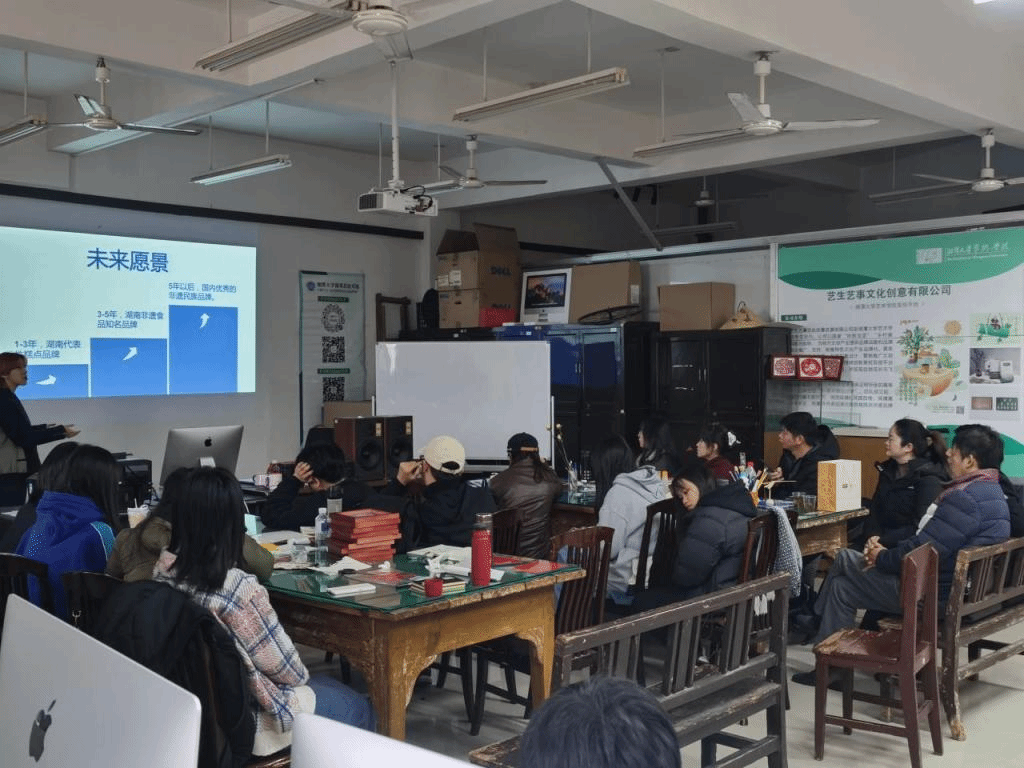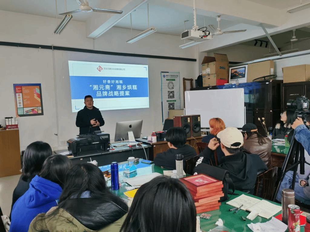 活动开始,由艺生艺事湘乡烘糕项目组经理贾宇介绍提案内容。艺生艺事创新创业团队从市场调研数据出发,分析了湘乡烘糕现今的行业发展现状,并对湘元斋品牌的优劣势进行了专业客观的阐述,湘元斋品牌如何有效参与行业竞争、打造品牌差异化,精准定位把脉。以系统的分析为品牌战略提供支点,根据推导结果,设计品牌矩阵。随后贾经理展示介绍了根据前期调研结果艺生艺事团队各项目组的产品设计内容,针对不同的目标消费人群,推出各具特色的产品。