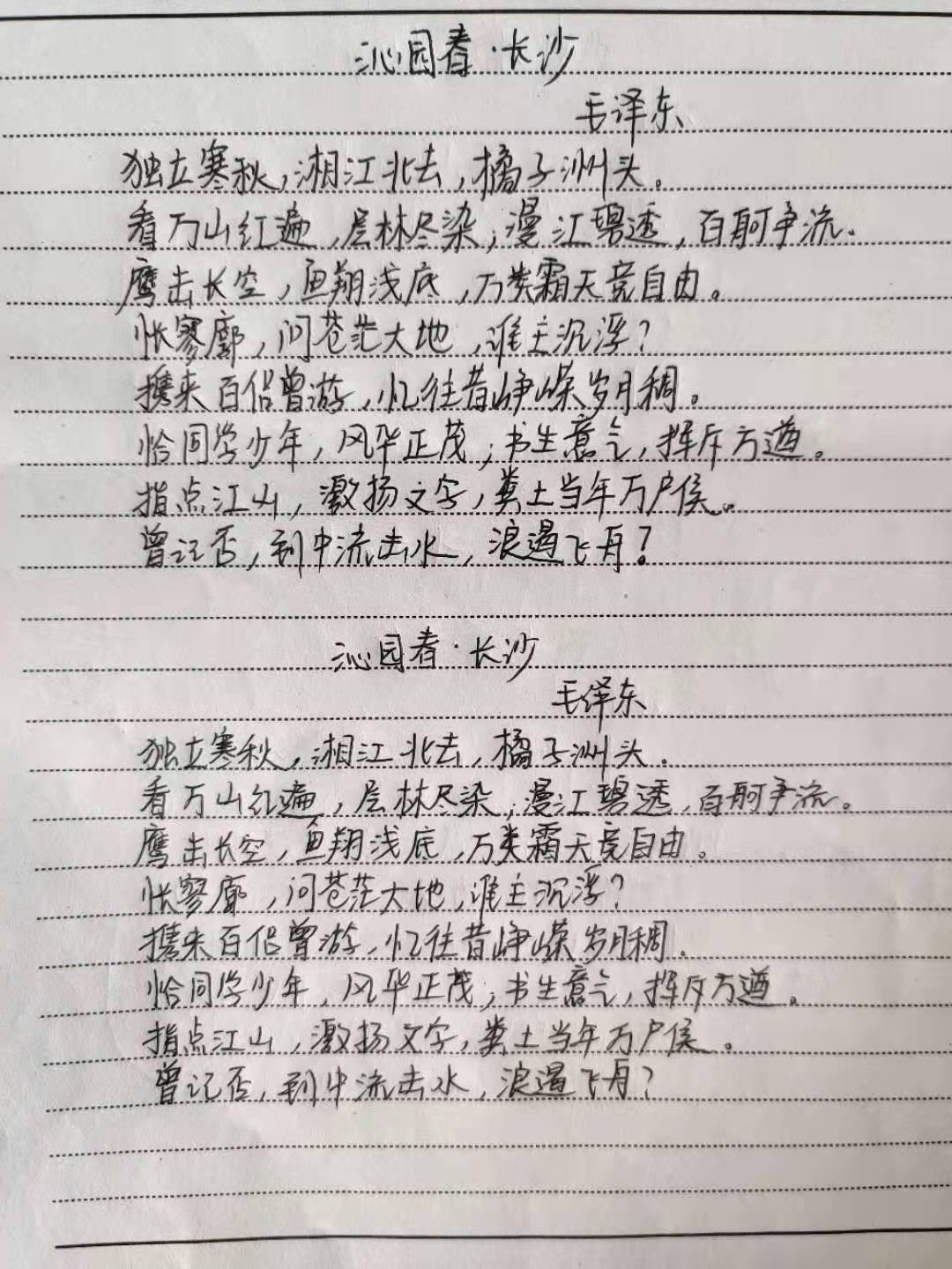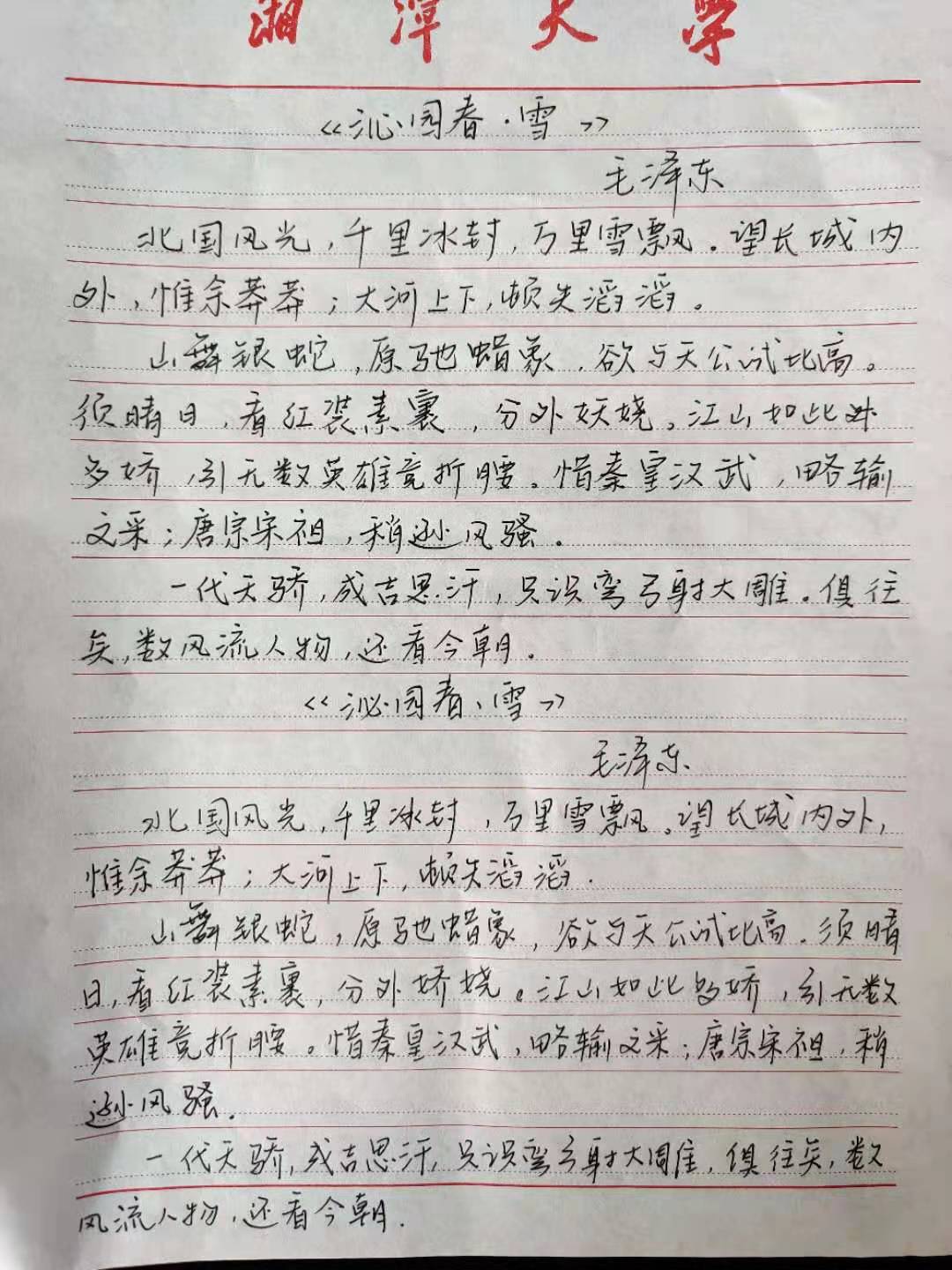 本学期,在延续开展读毛诗活动之外,集团发起了#未及时健康打卡,抄经典毛诗语录#活动,针对每周未打卡3次及以上者、迟到、旷课、差寝者,抄写硬笔字;迟到、旷课、差寝,屡教不改者需抄写毛笔字,并根据次数不同设置相应抄写字数。一笔一划落笔,一字一句入心。以崇敬之心和挚爱之情抄写毛诗,让同学们在字字句句中感悟伟人豪情、回顾历史岁月、珍惜当下生活。通过此活动,同学们不仅做到健康信息填报及时,更能够在快节奏、被网络充斥的生活中,放下手机,感受诗词蕴藏魅力。