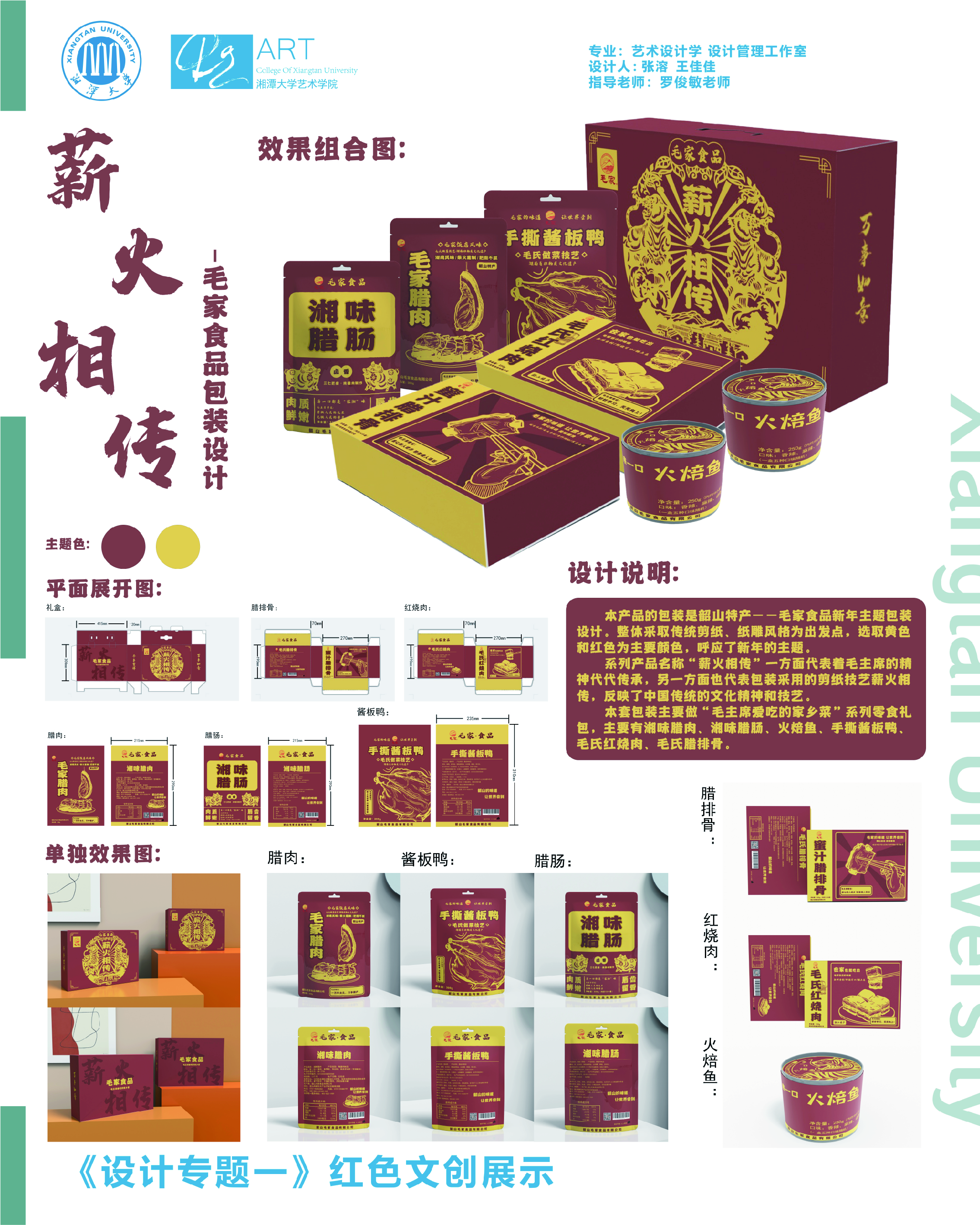(通讯员:罗俊敏)yl23411永利集团官网2019级设计管理工作室《设计专题一》课程迎来了学生终期汇报。此次课程汇报中,yl23411永利集团官网的同学们针对韶山红色文化,设计了红色文创及韶山毛家食品包装作品9套作为课程作业,彰显了课程思政教改成果。
