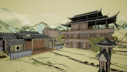 《土坪印象》主要通过娄底土坪村风土人情以及古朴自然的景观来体现土坪村轻松悠然的氛围。作品风格参考了千里江山图,为了达到理想中的水墨风格,作者陈晨同学在技术上使用了虚幻引擎中的基础材质节点制作出水墨材质,让画面体现出水墨的质感,为土坪村的乡村文化振兴助力。