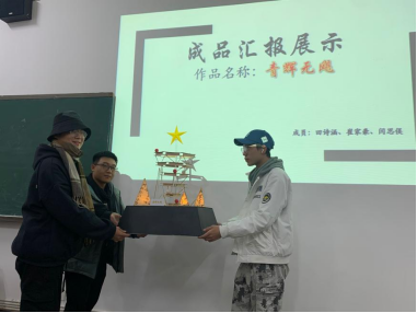 汇报分两天进行,共87个学习小组分别对作品的指导思想、创作思路和表现手法等进行了汇报。同学们从选题背景、作品介绍、艺术构思和感悟总结四个方面讲解自己的艺术作品。“青年毛泽东用‘二十八画生’这个笔名发布征友启示给了我们学习小组震撼和灵感。我们小组认真研读后,希望通过立体设计展现率先觉醒的中国青年怀抱着对国家深沉的大爱,寻觅同道者一同救国的革命热情。创作过程中我们采用材料拼接和穿插构成的方式,利用木棒、雪糕棒、雪弗板、超轻粘土和玻璃丝进行创作,飓风象征着牢笼束缚着当时的国民,四周围绕的群星正如征友启示展现的凝聚力和号召力,高昂的五星代表着先进青年冲出牢笼的决心。作为一名新时代新青年,我们要以党的二十大精神为指引,向第二个百年奋斗目标迈进,做到‘青辉无飓’,为国争光!”2022级艺术设计学二班田诗涵说道。